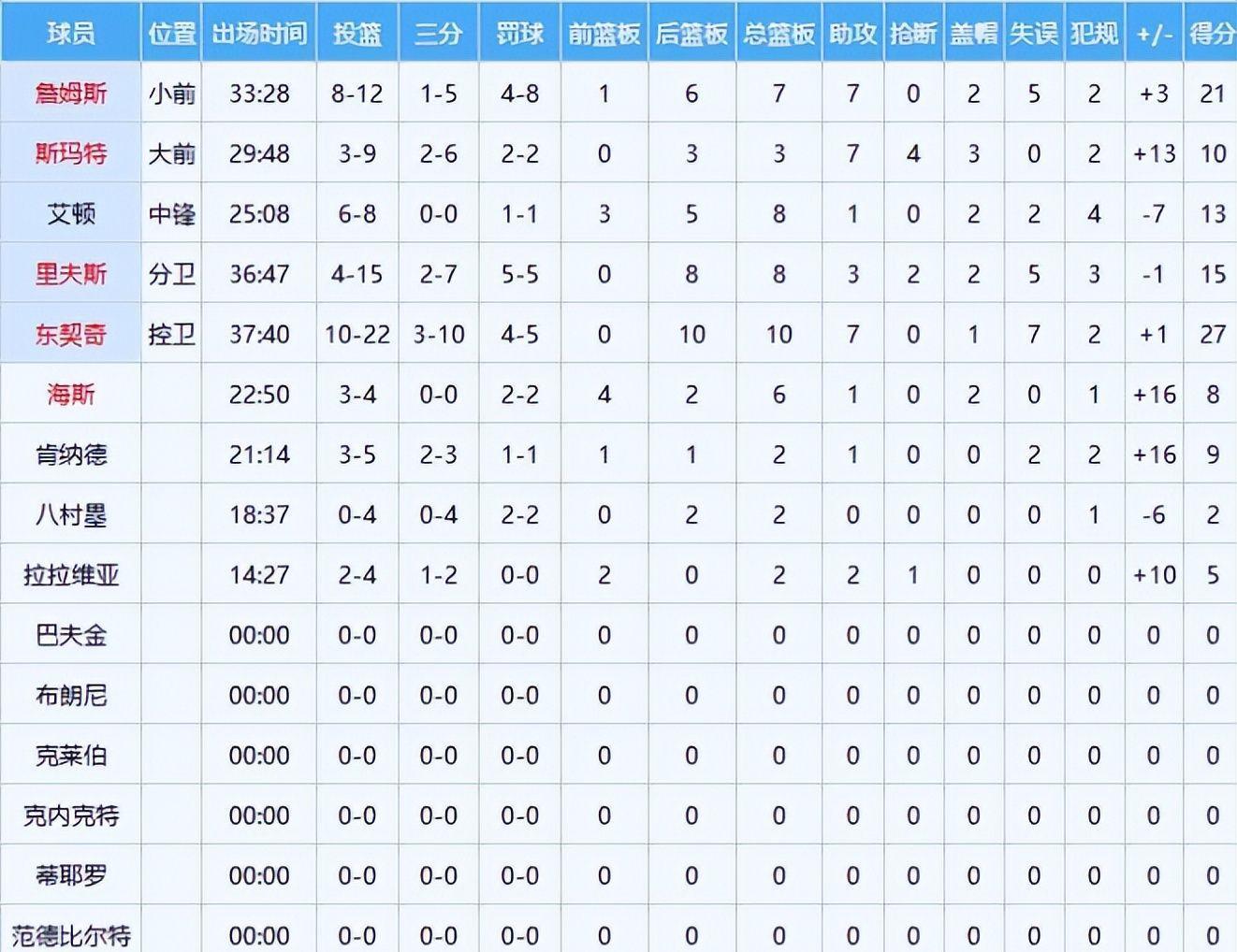 詹姆斯出场约33分钟,21分7篮板7助攻2盖帽的数据依旧稳健厚重,但在得分爆发力、关键回合终结选择及第四节攻坚硬度方面,相较东契奇略显保守,更多承担的是经验引导与节奏锚定角色。