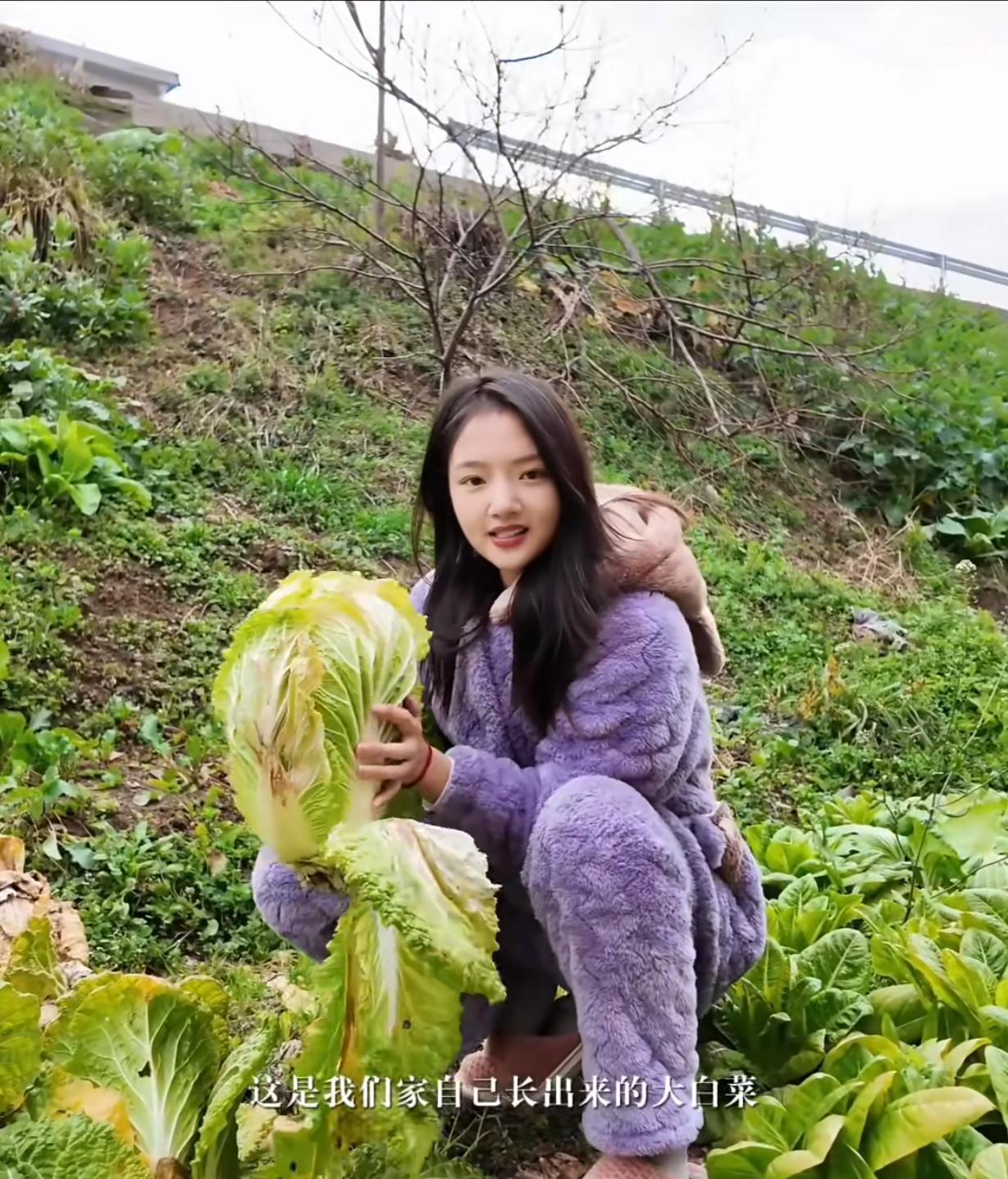 她还穿着省服+棉拖鞋,到自家地里摘大白菜。