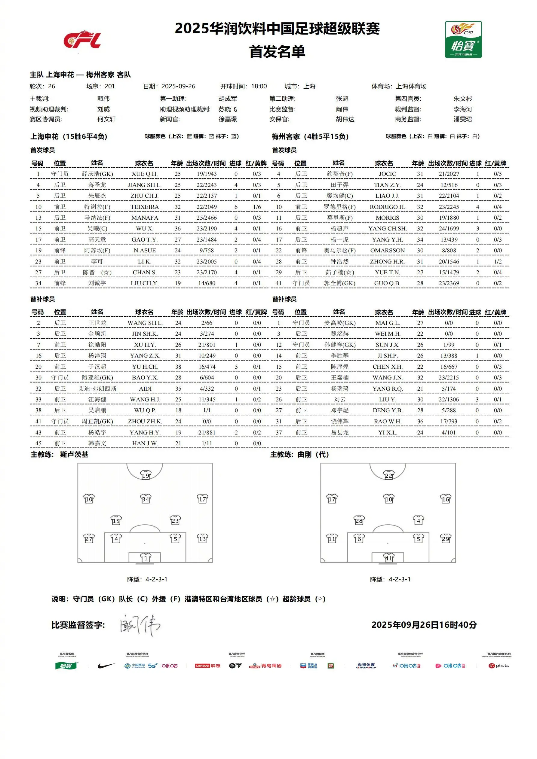 虎扑09月26日讯 今天18:00,上海申花即将在主场迎战梅州客家,赛前双方公布首发名单。